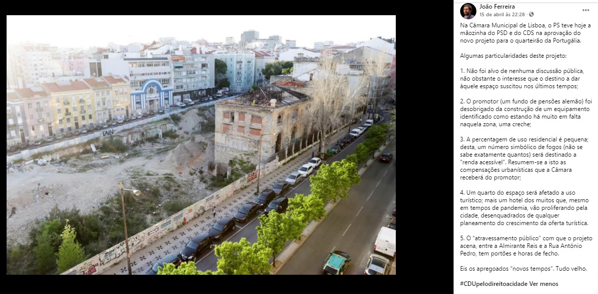 "Na Câmara Municipal de Lisboa, o PS teve hoje a mãozinha do PSD e do CDS na aprovação do novo projeto para o quarteirão da Portugália. Algumas particularidades deste projeto: não foi alvo de nenhuma discussão pública, não obstante o interesse que o destino a dar àquele espaço suscitou nos últimos tempos; o promotor (...) foi desobrigado da construção de um equipamento identificado como estando há muito em falta naquela zona, uma creche; a percentagem de uso residencial é pequena (...) um número simbólico de fogos (não se sabe exatamente quantos) será destinado a 'renda acessível' (...); um quarto do espaço será afetado a uso turístico (...); o “atravessamento público” com que o projeto acena, entre a Almirante Reis e a Rua António Pedro, tem portões e horas de fecho", descreve-se na publicação partilhada por João Ferreira.