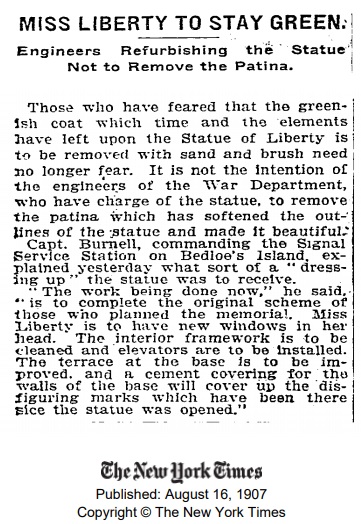 No ano de 1906 pensou em pintar-se novamente o monumento mas, de acordo com a Snopes, a ideia caiu por terra. Num artigo da época do jornal "The New York Times" pode ler-se: "Para aqueles que temeram que a vestimenta esverdeada que o tempo e os elementos naturais deixaram na Estátua da Liberdade fossem removidos (...) podem estar descansados. Não é a intenção dos engenheiros do Departamento de Guerra (...) remover a pátina que tem tornado a estátua bela e suavizado os seus contornos".