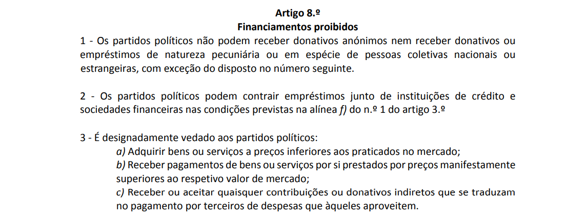 Consultando a lei do financiamento dos partidos políticos e das campanhas eleitorais, pode ler-se que "os partidos políticos não podem receber donativos anónimos nem receber donativos ou empréstimos de natureza pecuniária ou em espécie de pessoas coletivas nacionais ou estrangeiras". A exceção são os empréstimos contraídos junto de instituições de crédito e sociedades financeiras, desde que o produto de empréstimos cumpra os termos das regras gerais da atividade dos mercados financeiros.