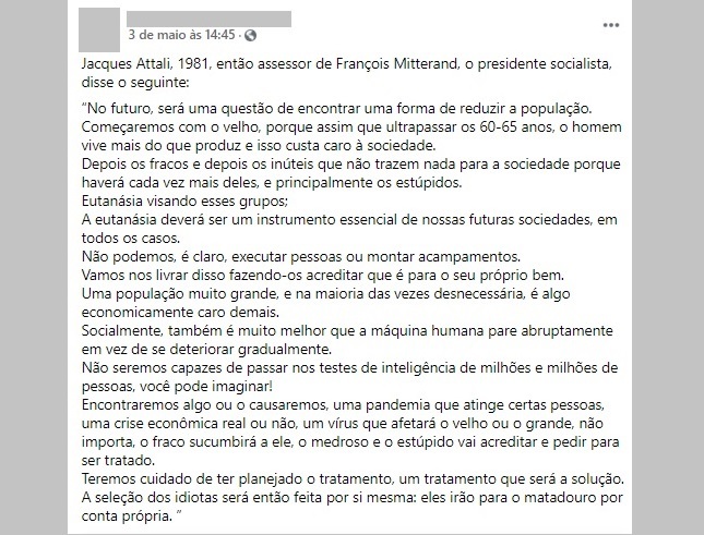 "Jacques Attali, 1981, então assessor de François Mitterrand, o presidente socialista, disse o seguinte: no futuro, será uma questão de encontrar uma forma de reduzir a população. Começaremos com o velho, porque assim que ultrapassar os 60-65 anos, o homem vive mais do que produz e isso custa caro à sociedade. Depois os fracos e depois os inúteis que não trazem nada para a sociedade porque haverá cada vez mais deles, e principalmente os estúpidos. A eutanásia deverá ser um instrumento essencial de nossas futuras sociedades, em todos os casos", terá dito ou escrito Jacques Attali, numa citação que lhe é atribuída em múltiplas publicações detetadas pelo Polígrafo nas redes sociais.