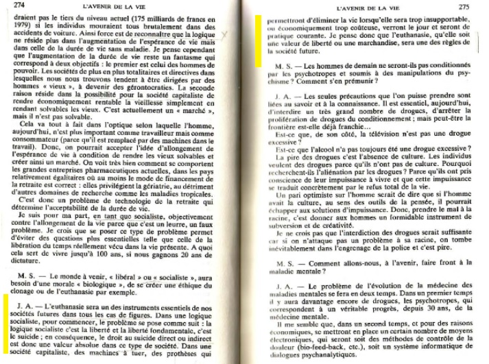 E conclui: "A eutanásia será um dos instrumentos essenciais das nossas futuras sociedades em todos os casos. Numa lógica socialista, para começar, o problema é o seguinte: a lógica socialista é a liberdade e a liberdade fundamental é o suicídio. Consequentemente, o direito ao suicídio direto ou indireto é um valor absoluto nesse tipo de sociedade. Numa sociedade capitalista, as máquinas de matar que tornarão possível eliminar a vida quando ela for demasiado insuportável ou economicamente muito cara, aparecerão e serão uma prática comum. Acredito, portanto, que a eutanásia, seja como um valor de liberdade ou como uma mercadoria, será uma das regras da sociedade do futuro”.