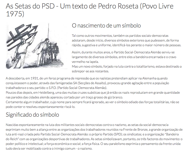 É verdade que as três setas do símbolo do PSD (antigo PPD) têm origem ou inspiração na luta dos sociais-democratas contra o nazismo na Alemanha? A autoria da ideia do símbolo é comummente atribuída a Augusto Cid, veterano caricaturista, ilustrador e escultor. Quanto à explicação sobre a origem e o conceito do símbolo, o texto mais referenciado e citado foi escrito pelo jurista Pedro Roseta e publicado no jornal “Povo Livre”, edição de 4 de março de 1975.