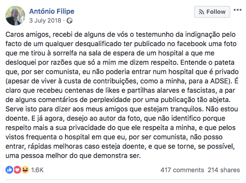 “Caros amigos, recebi de alguns de vós o testemunho da indignação pelo facto de um qualquer desqualificado ter publicado no Facebook uma foto que me tirou à sorrelfa na sala de espera de um hospital a que me desloquei por razões que só a mim me dizem respeito. Entende o pateta que, por ser comunista, eu não poderia entrar num hospital que é privado (apesar de viver à custa de contribuições, como a minha, para a ADSE). É claro que recebeu centenas de likes e partilhas alarves e fascistas, a par de alguns comentários de perplexidade por uma publicação tão abjeta”, escreveu então António Filipe, na sua página pessoal na rede social Facebook.