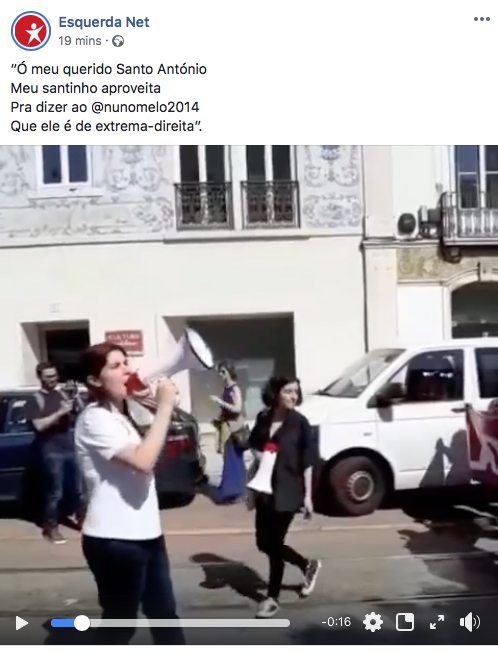 "Ó meu querido Santo António; Meu santinho aproveita; Pra dizer ao Nuno Melo; Que ele é de extrema-direita", terão cantado vários dirigentes, deputados e militantes do BE (com destaque para Catarina Martins e Mariana Mortágua), desta vez nas comemorações do 1º de maio, também em Lisboa. O vídeo do novo cântico está a tornar-se viral nas redes sociais, alimentando uma nova polémica.