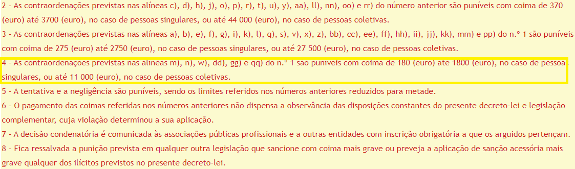 De acordo com o regime jurídico, sublinha Ribeiro, "a contra-ordenação em causa é punida com coima de 180 euros até 1.800 euros, no caso de pessoas singulares, ou até 11.000 euros, no caso de pessoas coletivas".