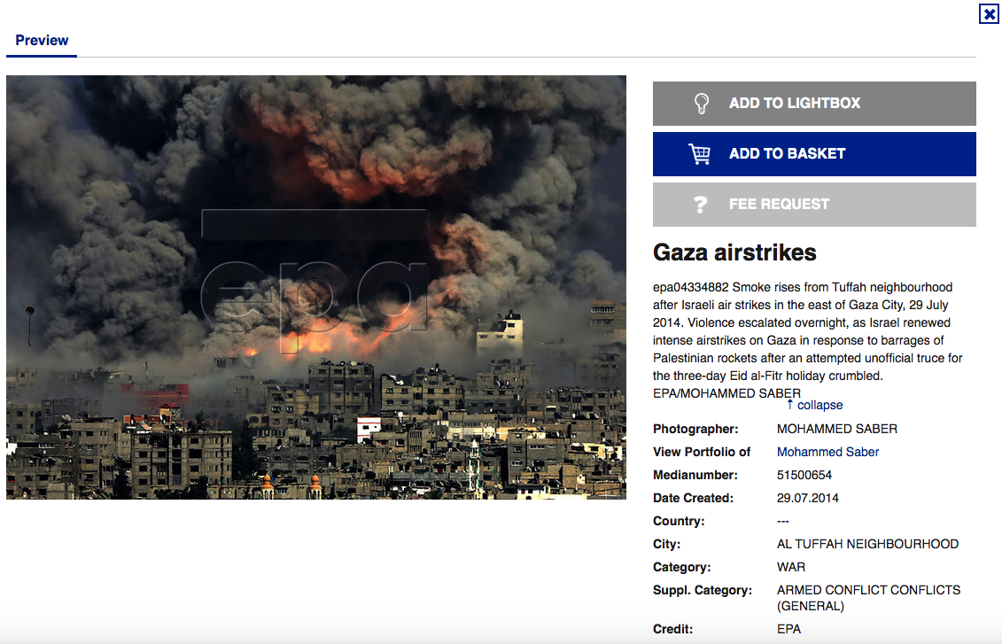 Uma pesquisa inversa pela imagem no Google revela que a fotografia foi captada no dia 29 de julho de 2014, por Mohammed Saber, um fotógrafo da European Pressphoto Agency (EPA), tal como se pode ver no próprio site da agência (pesquisa pelo código da imagem epa04334882).
