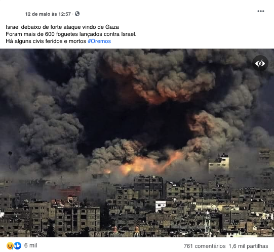 "Israel debaixo de forte ataque vindo de Gaza. Foram mais de 600 foguetes lançados contra Israel. Há alguns civis feridos e mortos #Oremos", lê-se numa das muitas publicações em que é partilhada uma fotografia na qual vemos os momentos imediatamente a seguir ao bombardeamento, com uma densa nuvem de fumo no horizonte.