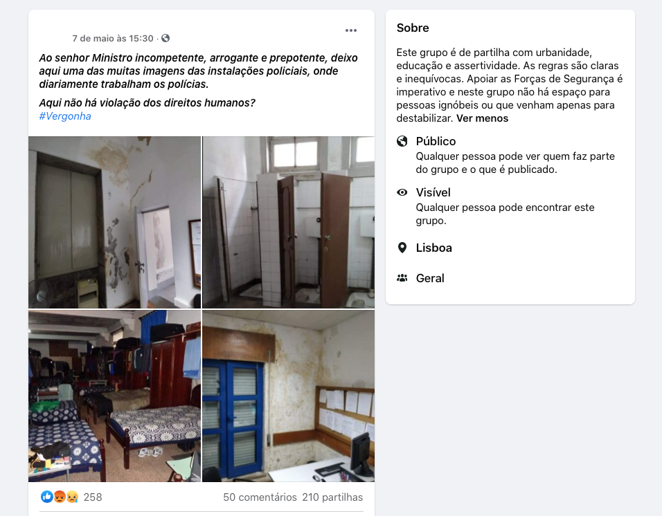 "Ao senhor ministro incompetente, arrogante e prepotente, deixo aqui uma das muitas imagens das instalações policiais onde diariamente trabalham os polícias. Aqui não há violação dos direitos humanos? Vergonha", lê-se no post de 7 de maio, publicado na página "Polícia Profissão de Risco" (um grupo público no Facebook) que visa "apoiar as Forças de Segurança".