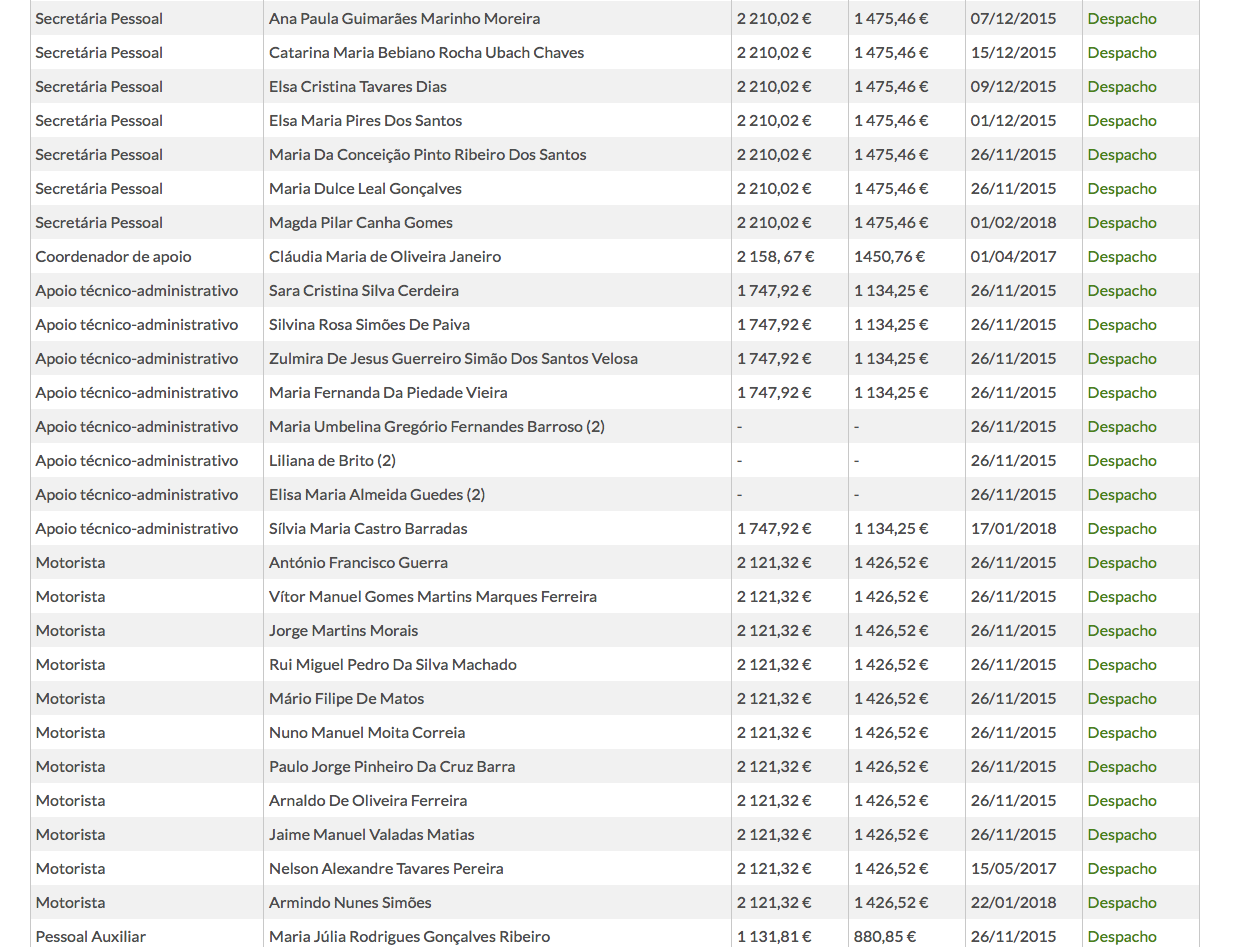 Além de um chefe de gabinete (rendimento bruto de 5.456 euros por mês), contabilizam-se também nove assessores (4.352 euros), 12 adjuntos (3.854 euros), dois técnicos especialistas (4.862 e 3.854 euros, respetivamente), sete secretárias pessoais (2.210 euros), uma coordenadora de apoio (2.158 euros), oito elementos de apoio técnico-administrativo (1.747 euros), 11 motoristas (2.121 euros) e ainda nove elementos de pessoal auxiliar (1.131 euros). Estes valores de rendimento bruto incluem despesas de representação e subsídio de refeição, segundo indica a página do Governo.