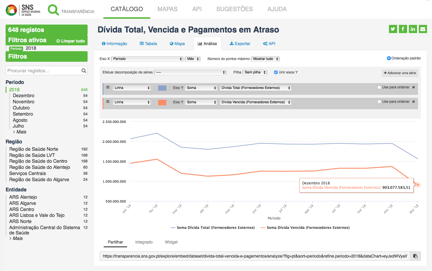 Esta informação é verdadeira? Os dados podem ser conferidos no portal "Transparência" do próprio Serviço Nacional de Saúde, nomeadamente nas tabelas e gráficos que indicam a dívida total, vencida e pagamentos em atraso (pode aceder aqui). De acordo com os dados mais recentes, em dezembro de 2018, a soma de dívida vencida a fornecedores externos cifrava-se em mais de 903 milhões de euros. No mês anterior era de 1,3 mil milhões de euros, representando assim uma diminuição substancial, na ordem dos 400 milhões de euros, ainda assim distante da "redução de 50%" propalada na publicação em análise.