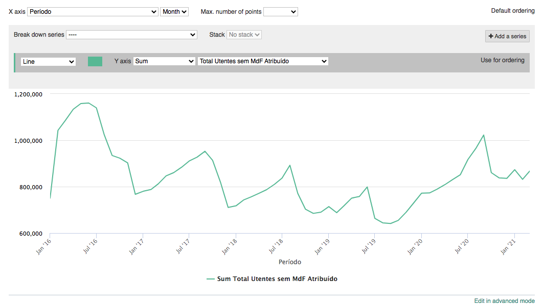 De outubro de 2020 até março de 2021 (último mês disponível), houve uma descida para valores que se têm mantido entre os 800.000 e os 900.000 utentes sem médico de família atribuído.