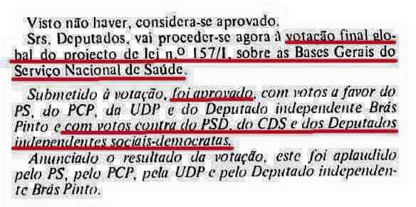 A verdade é que o PSD, juntamente com o CDS, votou contra a chamada “lei Arnaut”, quando ela foi levada ao Parlamento, onde foi aprovada com os votos favoráveis do PS, do PCP, da UDP e do deputado independente Brás Pinto. Na base da recusa da direita esteve o facto de o texto consagrar um SNS “universal e gratuito”.