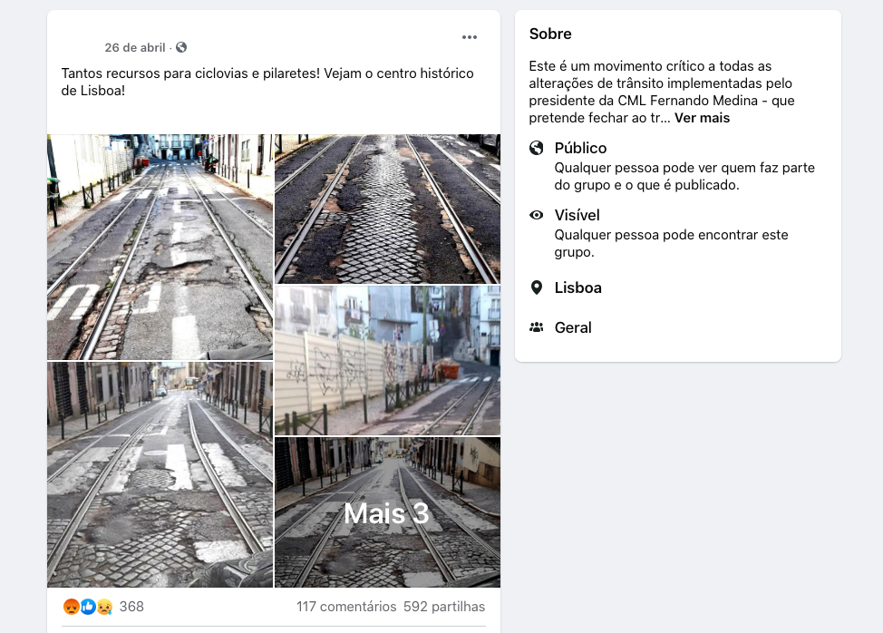 "Tantos recursos para ciclovias e pilaretes! Vejam o centro histórico de Lisboa!". Esta é a mensagem do post de 26 de abril no Facebook que acumula cerca de 600 partilhas. Exibe uma série de fotografias de ruas no centro histórico de Lisboa em que os pavimentos (sobretudo em vias de passagem dos elétricos da Carris) estão visivelmente degradados e esburacados.