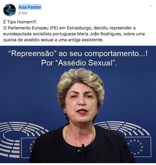 "É Tipo Homem?! O Parlamento Europeu (PE) em Estrasburgo, decidiu repreender a eurodeputada socialista portuguesa Maria João Rodrigues, sobre uma queixa de assédio sexual a uma antiga assistente". Esta é a mensagem que acompanha a publicação de um meme no "Grupo de Apoio ao Juiz Carlos Alexandre", página com mais de 100 mil seguidores na rede social Facebook.