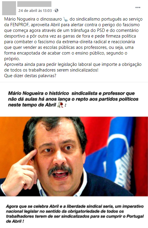 O que está em causa?"Agora que se celebra Abril e a liberdade sindical, seria um imperativo nacional legislar no sentido da obrigatoriedade de todos os trabalhadores terem de ser sindicalizados", destaca-se num "post" no Facebook que atribui estas palavras a Mário Nogueira, secretário-geral da Fenprof. Verificação de factos.