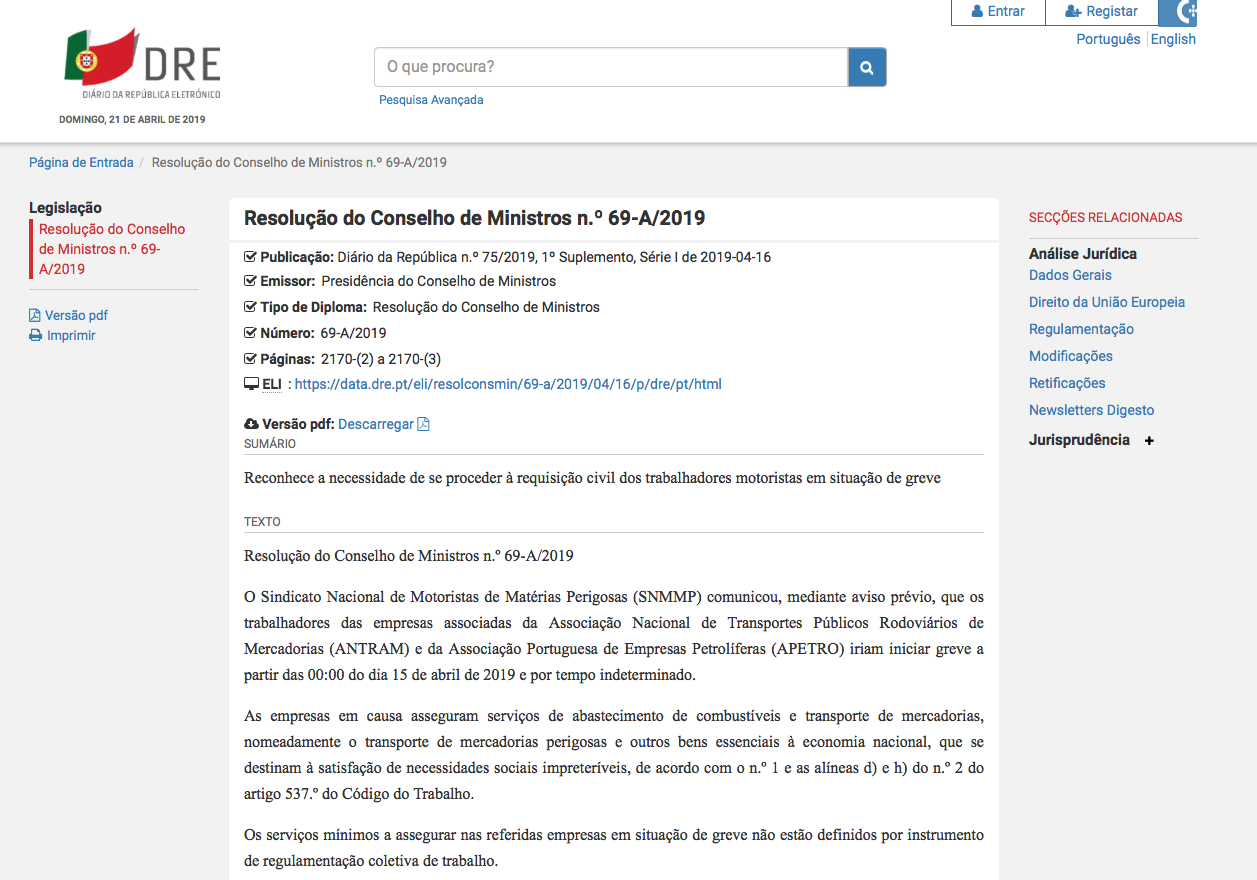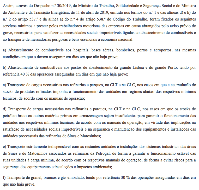 De acordo com a Resolução do Conselho de Ministros n.º 69-A/2019, publicada em "Diário da República" no dia 16 de abril de 2019, "através do Despacho n.º 30/2019, do Ministro do Trabalho, Solidariedade e Segurança Social e do Ministro do Ambiente e da Transição Energética, de 11 de abril de 2019, (…) foram fixados os seguintes serviços mínimos a prestar pelos trabalhadores motoristas das empresas em causa abrangidos pelo aviso prévio de greve, necessários para satisfazer as necessidades sociais impreteríveis ligadas ao abastecimento de combustíveis e ao transporte de mercadorias perigosas e bens essenciais à economia nacional: