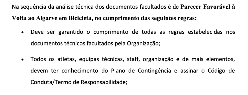 É preciso recuar ao dia 22 de abril e ao "Parecer 018 Covid-19", emitido pela Autoridade de Saúde Regional do Algarve (ARS Algarve), documento onde é autorizada a realização da Volta ao Algarve em Bicicleta, com a obrigatoriedade de serem cumpridas "todas as regras estabelecidas nos documentos técnicos [Plano de Contingência] facultados pela Organização" (Federação Portuguesa de Ciclismo).