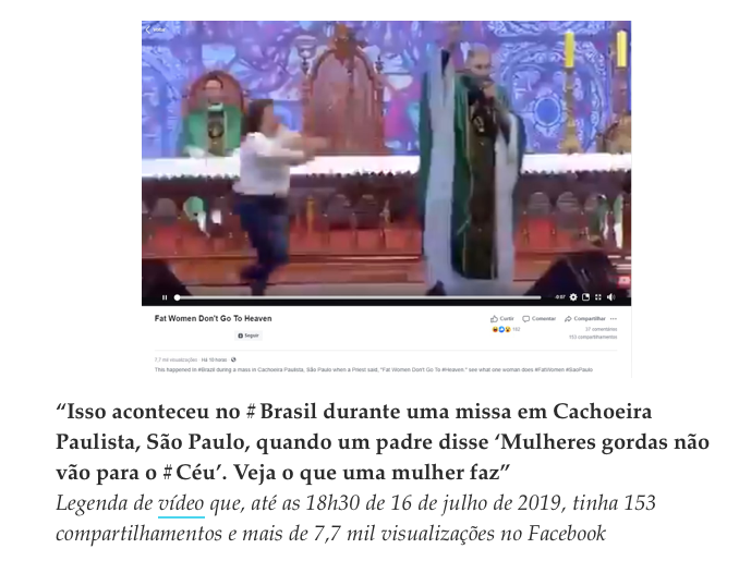 De acordo com a Agência Lupa, plataforma brasileira de fact-checking, "antes de ser atacado, o padre falava sobre a função de um sacerdote - e não fez nenhuma menção à frase atribuída a ele nas publicações que começaram a circular em outros países, de que 'mulheres gordas não vão para o céu' (leia aqui a homilia completa do padre Marcelo Rossi). 'Essas mãos não mais me pertencem. Pecadoras, fracas, mas essas mãos pertencem a Jesus. Tanto que o sacerdote age na pessoa de Cristo. Para servir, para abençoar', diz o padre. Nesse instante, é derrubado do palco. Ele não se feriu e continuou a missa depois da queda".