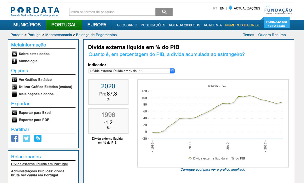 De acordo com os dados compilados na Pordata, a dívida externa líquida em percentagem do Produto Interno Bruto (PIB) tem vindo a aumentar desde a década de 1990, atingindo um pico de 107,6% em 2014.