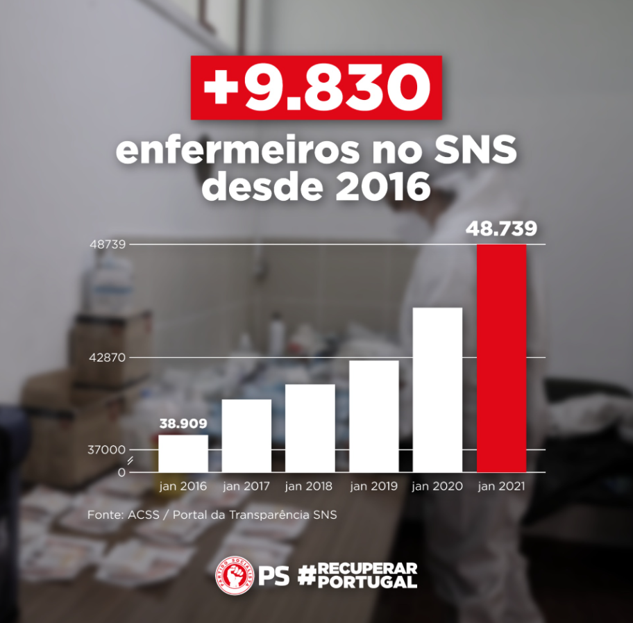 O que está em causa?Em publicação na página oficial de Facebook, o Partido Socialista afirma que, nos últimos cinco anos, aumentou o número de enfermeiros no Serviço Nacional de Saúde. Segundo o partido, entre 2016 e 2021, foram contratados mais 9.830 profissionais. Confirma-se?