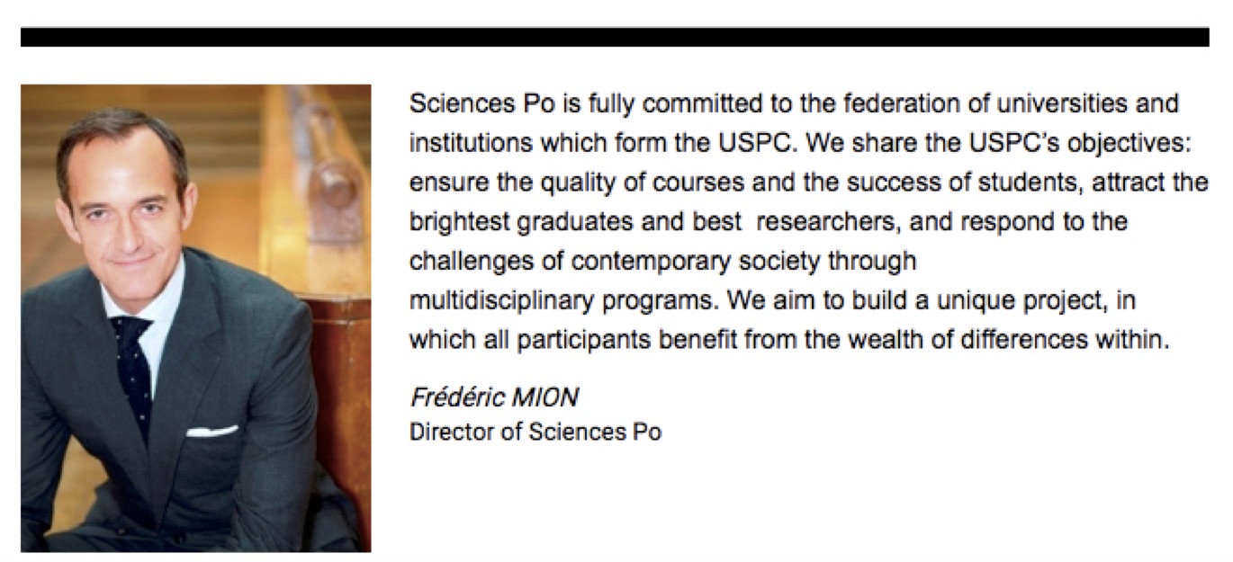 No site da Université Sorbonne Paris Cité é possível ler o seguinte depoimento de Frédéric MION, diretor da Sciences Po: “A Sciences Po está totalmente comprometida com a federação de universidades e instituições que constituem a USPC. Partilhamos os objetivos da USPC: assegurar a qualidade dos cursos e o sucesso dos estudantes, atrair os alunos mais brilhantes e os melhores investigadores, e responder aos desafios da sociedade contemporânea através de programas multidisciplinares.”