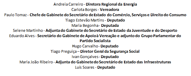 Os restantes cargos mencionados estão corretos e correspondem a dirigentes presentes no momento da fotografia. Paulo Tomaz é chefe de gabinete do secretário de Estado do Comércio, Serviços e Defesa do Consumidor; Tiago Estevão Martins, Maria Begonha e Ivan Gonçalves são deputados à Assembleia da República; Selene Martinho é mesmo adjunta do decretário de Estado da Juventude e Desporto; João Torres é secretário de Estado do Comércio, Serviços e Defesa do Consumidor; e Tiago Preguiça é, desde há poucos dias, Diretor-Geral da Segurança Social.
