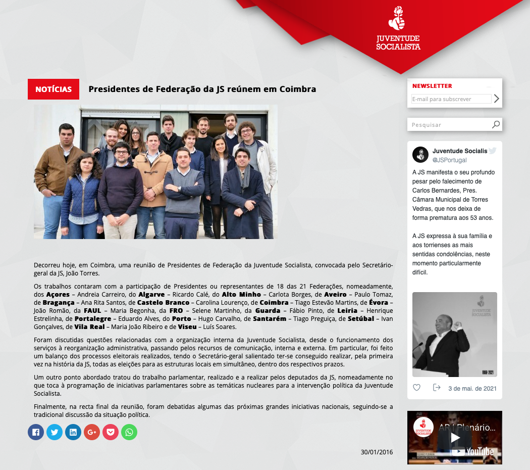 Analisando a imagem, verificamos que tem origem numa notícia da página oficial da JS, datada de 30 de janeiro de 2016, com o seguinte título: "Presidentes de Federação da JS reúnem em Coimbra". Nessa reunião participaram "presidentes ou representantes de 18 das 21 Federações".