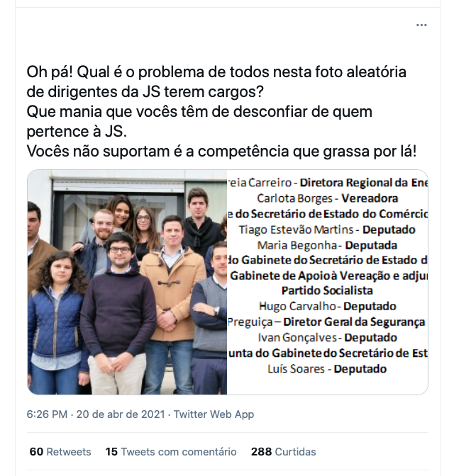 "Oh pá! Qual é o problema de todos nesta foto aleatória de dirigentes da JS terem cargos? Que mania que vocês têm de desconfiar de quem pertence à JS. Vocês não suportam é a competência que grassa por lá", destaca-se no texto da publicação que começou por ser difundida no Twitter e entretanto já foi adaptada para o Facebook, onde também está a ser partilhada.
